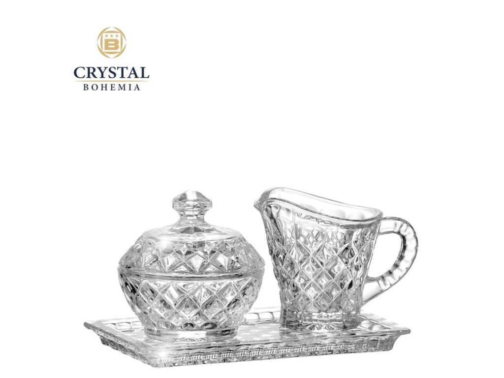 Souprava je složená z podnosu 19 cm, cukřenky o výčce 9,5 cm a mlékokvy o objemu 125 ml.