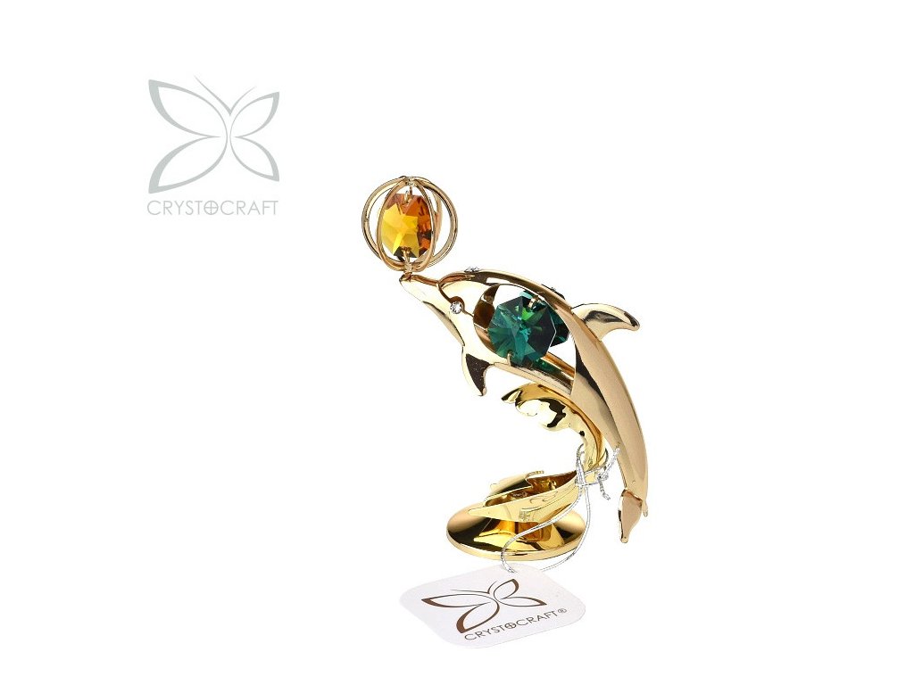Zlacená kovová figurka, dekorovaná barevnými křišťály Bohemia.