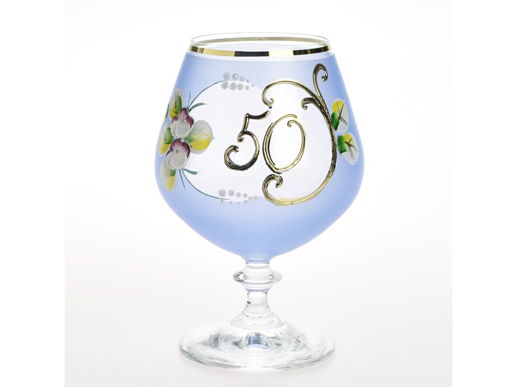-Unikátní design: Číše je ručně zdobena tradičním, vysoce kvalitním smaltem a pravým zlatem, což jí dodává luxusní a jedinečný vzhled. Modré sklo s elegantním motivem "50" je perfektní pro oslavu významného jubilea.